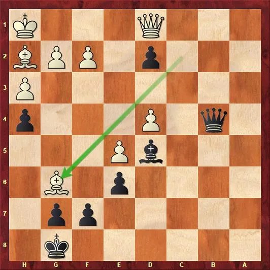 Carlsen abandonne à cause de Ta8# imparable, après 1…bxc6 2.bxc6.