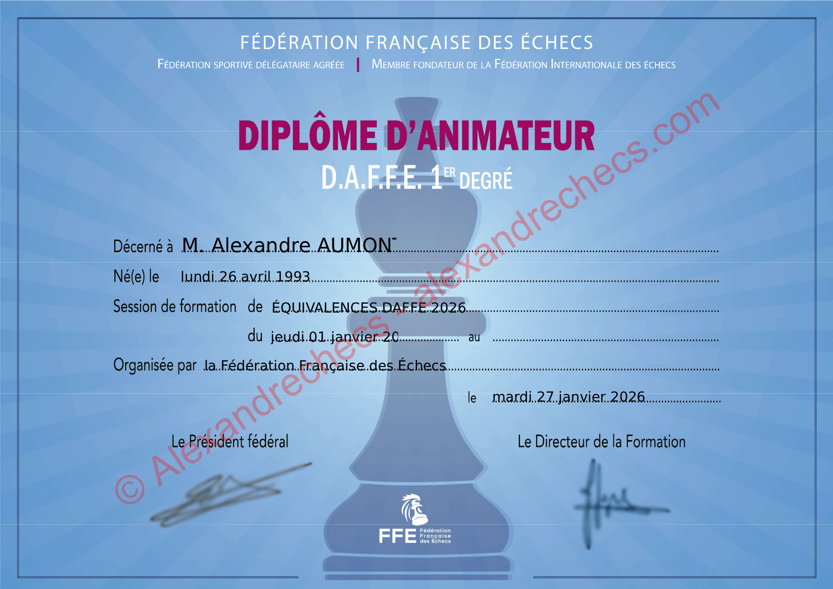 - Animateur de la Fédération Française des Échecs (DAFFE 1)